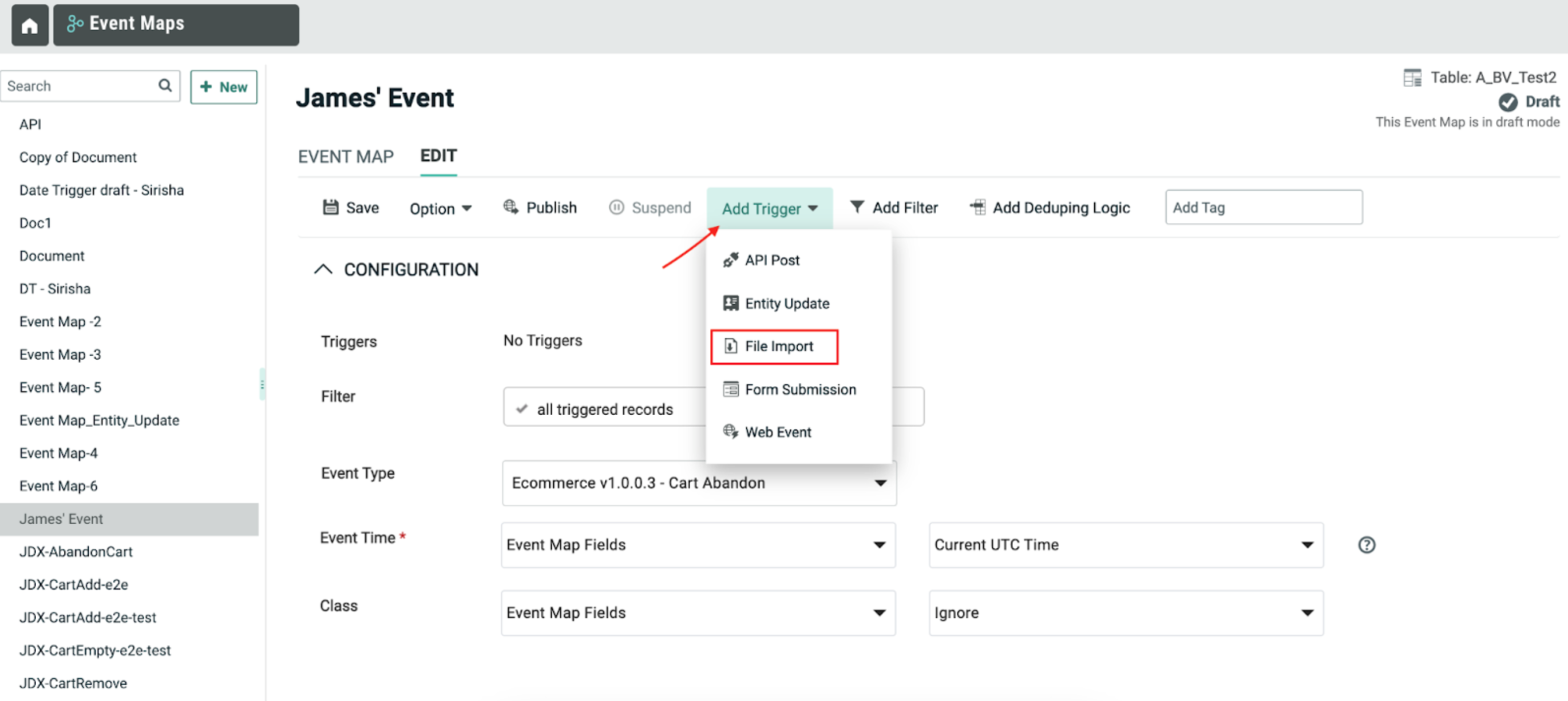In your Event Maps screen click the Add Trigger drop-down. Then select File Import.