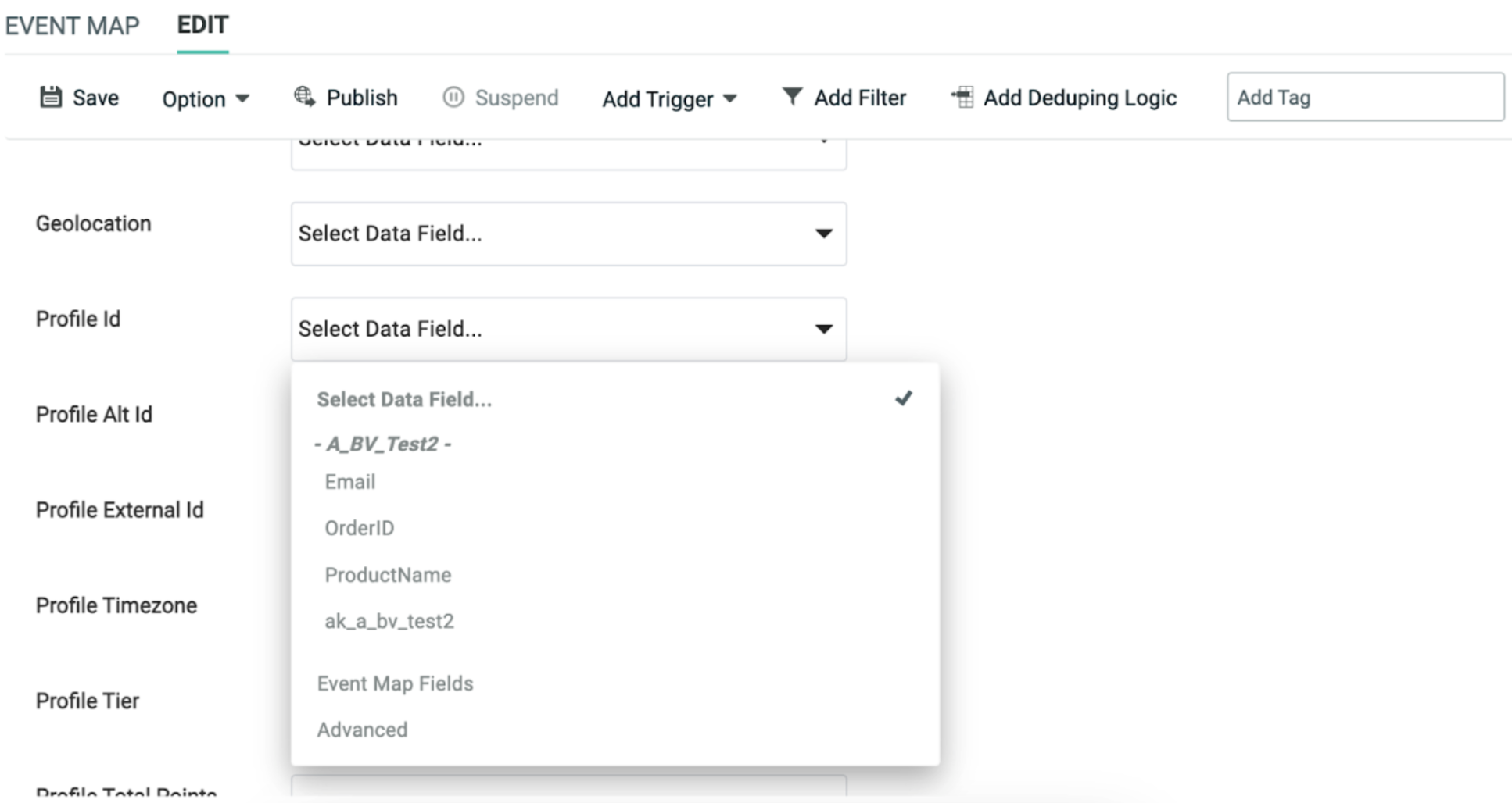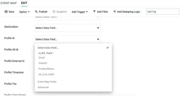 Scroll down in the event map section and find Profile ID. Select the Data Field drop-down and select PKID: