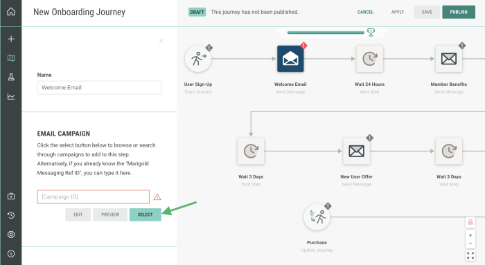 Ensure your Journey is configured to use the Marigold Moments in the Journey Settings.