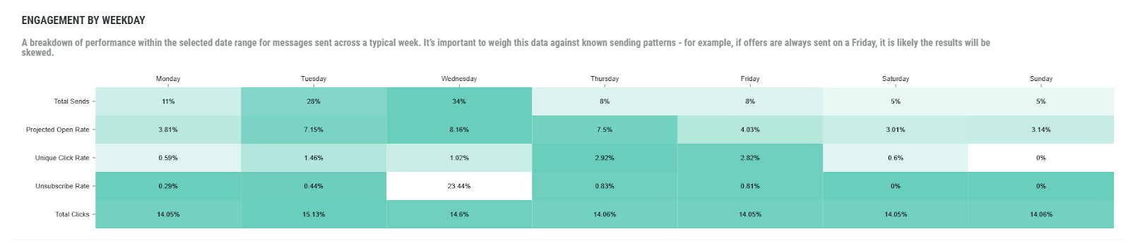 Key engagement metrics by day of the week, including: Total Send, Unique Click Rate, Unsubscribe Rate and more. At a glance display allows Marketers to: