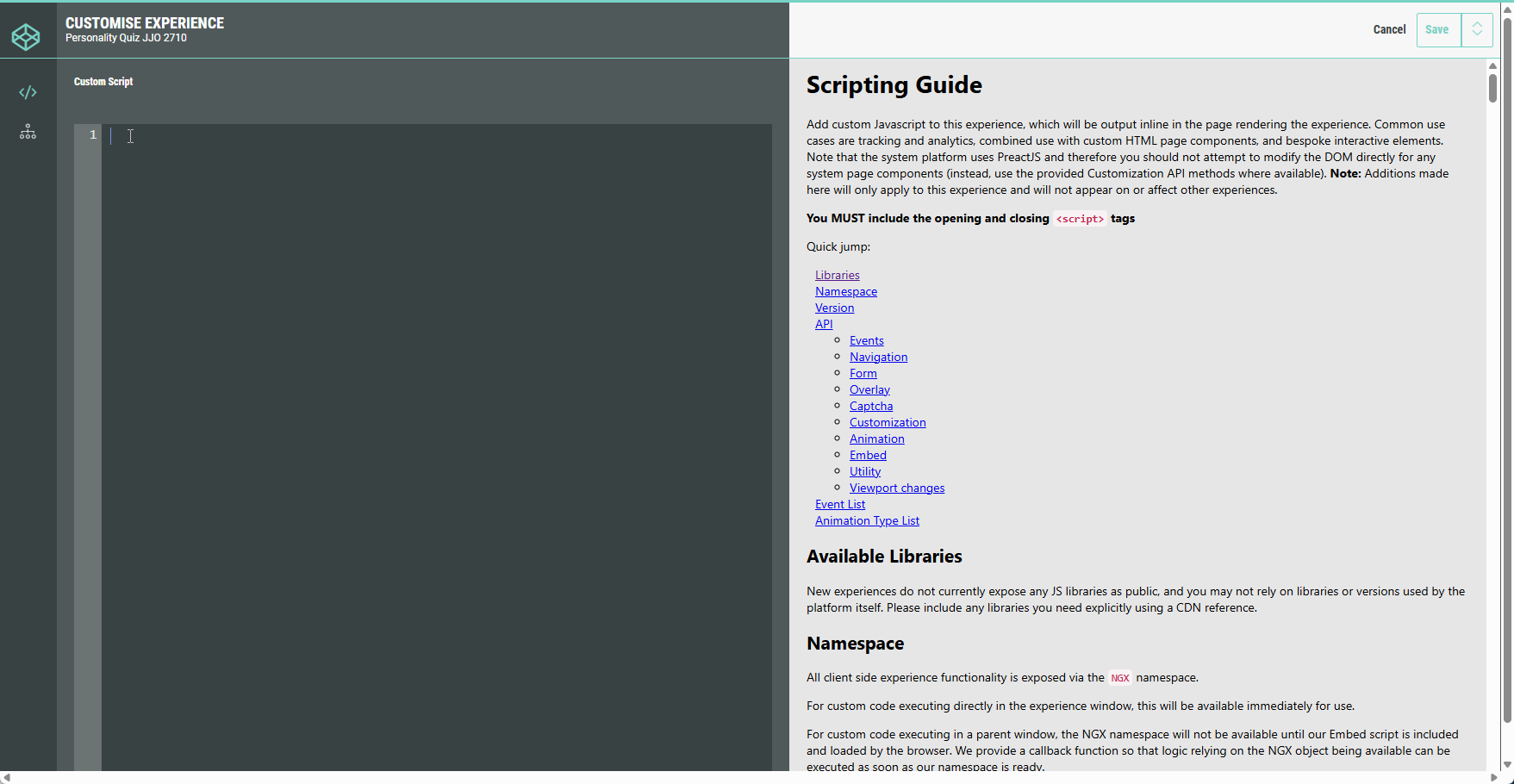 Add custom JavaScript to this Experience, which will be output inline in the page rendering the Experience.