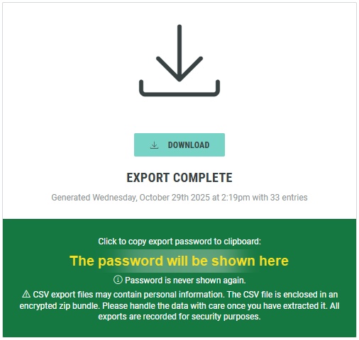 Note: The encryption password is shown when the export is ready to be downloaded.