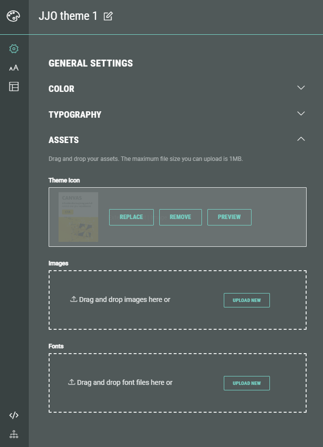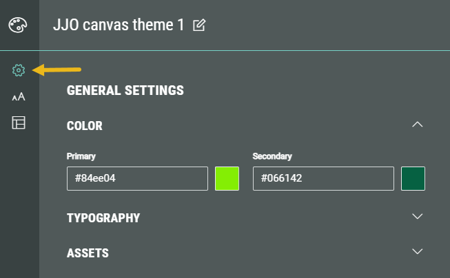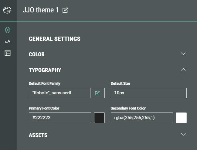 In the General Settings, the following sections can be seen: Color, Typography and Assets.