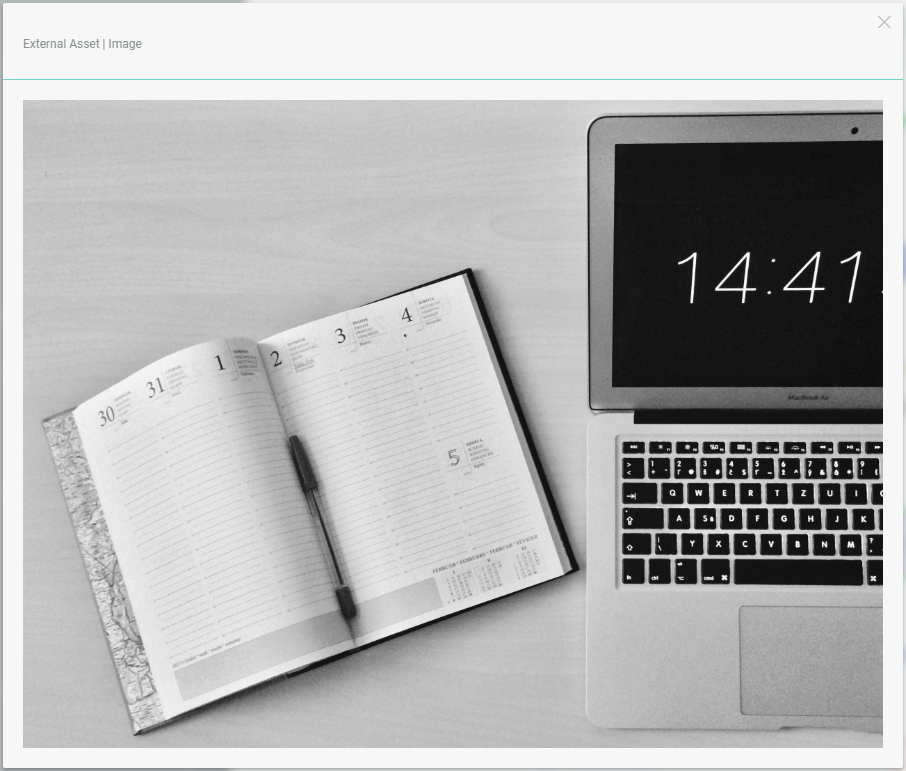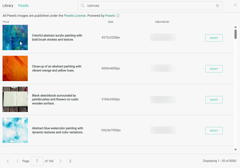 This will open a pop-up in which you can select an image from either your asset library (which contains your uploaded assets) or from Pexels.