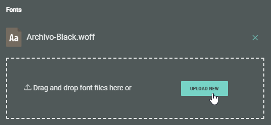 - Fonts — Custom fonts can be uploaded from your computer through the Upload New button or by dragging and dropping font files into the area.
