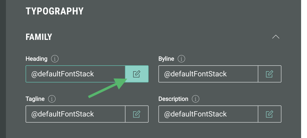 You can see the font family values set by default (inherited by the main theme's settings), which you can edit by manually typing in the field or by clicking on the Pencil icon next to each field.