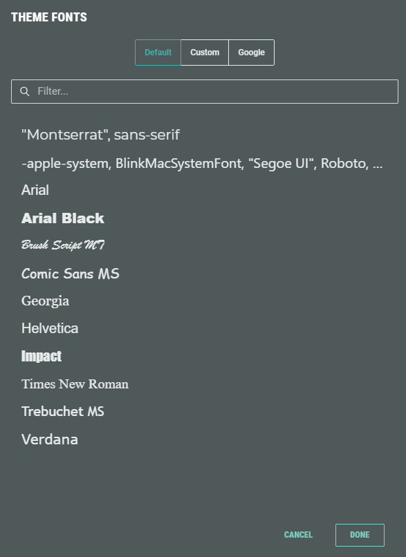 - Custom — Contains custom uploaded fonts. You can upload new fonts here. (*)