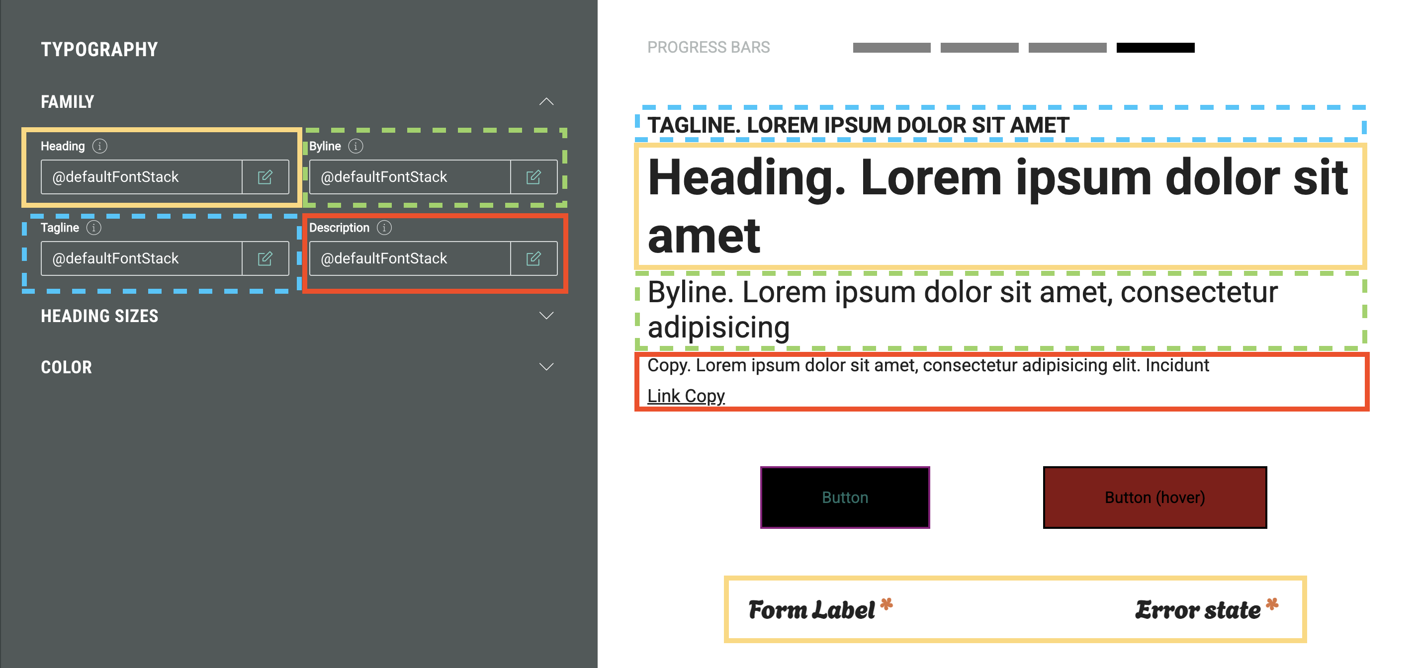 - Heading — Applies to h1, and labels in form and quiz modules.