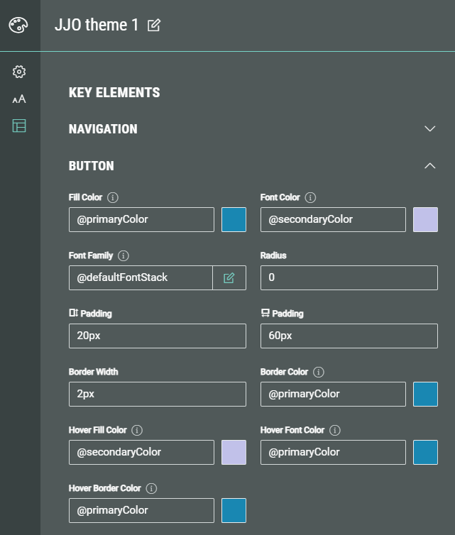 - Hover Fill Color — Applies to the color of the button (background) when the button is hovered.