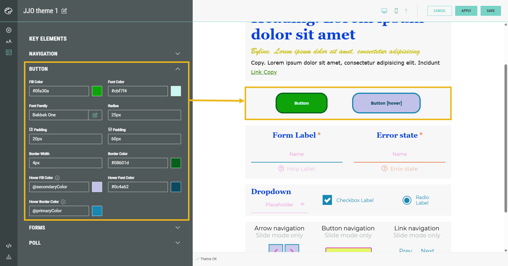 As these are general settings, in the preview on the right you can see that these colors impact different design elements (such as buttons, forms, etc).