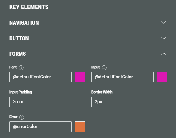 - Error — By default inherited from the theme's main settings. You can customize the font color used for error messages through the visual color picker or by entering a manual value in one of the following formats: #hex, rgb(), rgba(), browser constant, @variable, (formula).(note 1)