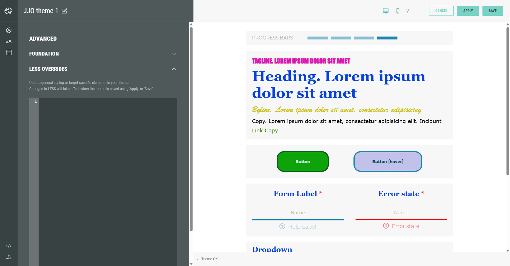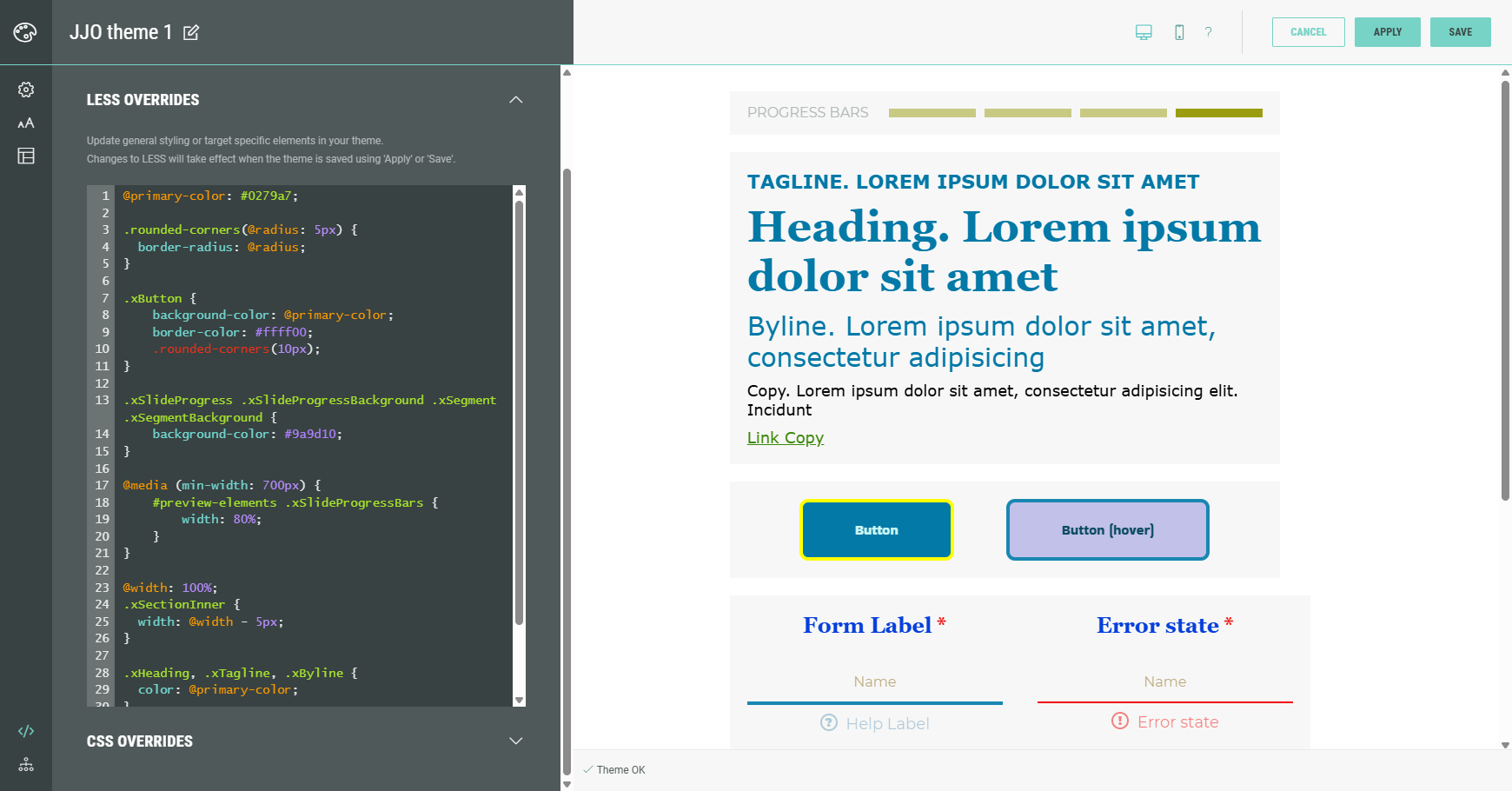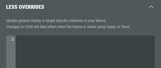 The LESS Overrides section allows you to update general styling or target specific elements in your theme, by manually writing LESS syntax in the field.