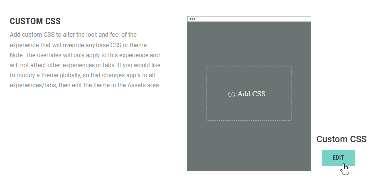 You can add custom CSS to alter the look and feel of the Experience. It will override any base CSS or theme.