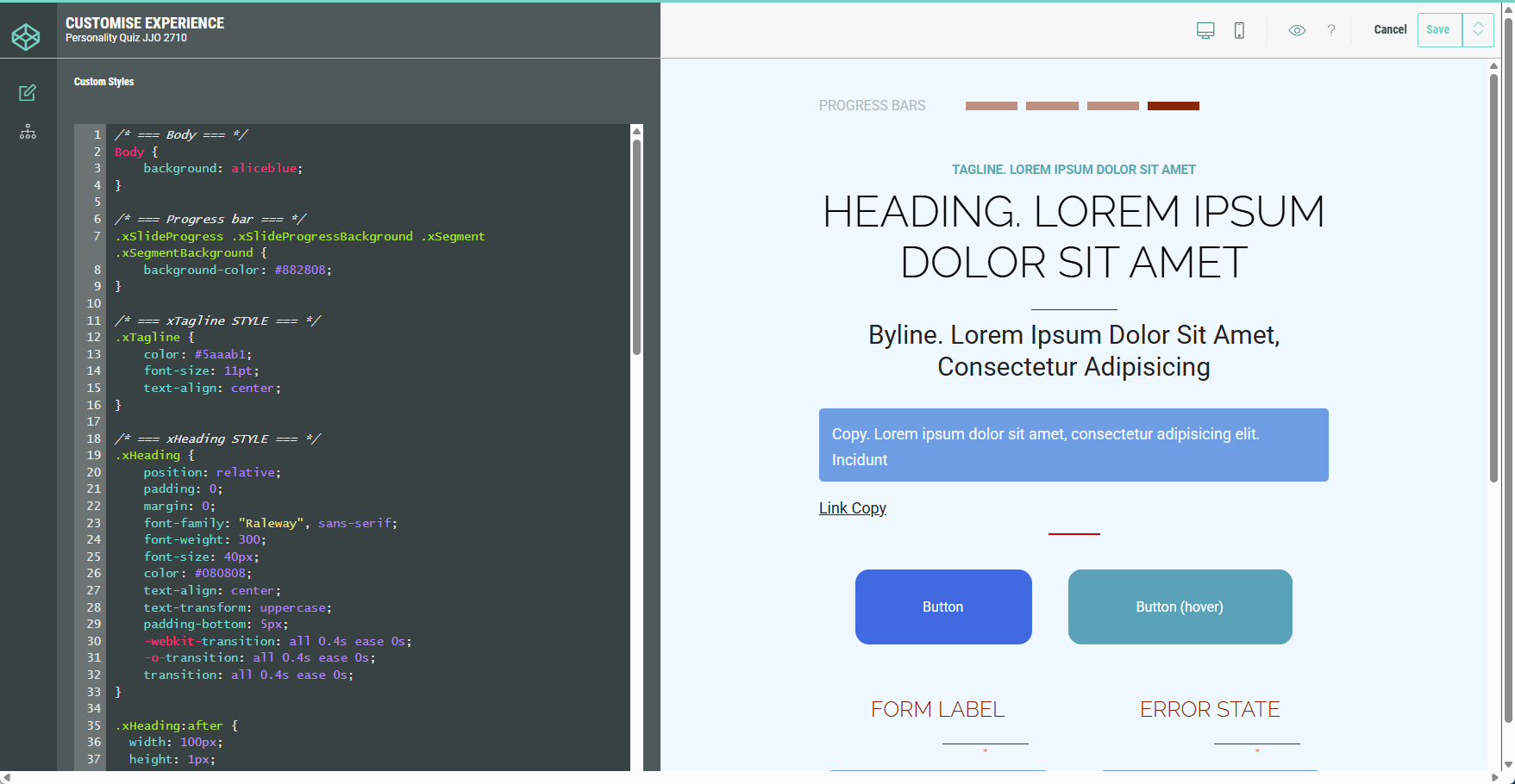 The Customize section is meant to be used by developers and designers that need advanced customization options for the Experience.