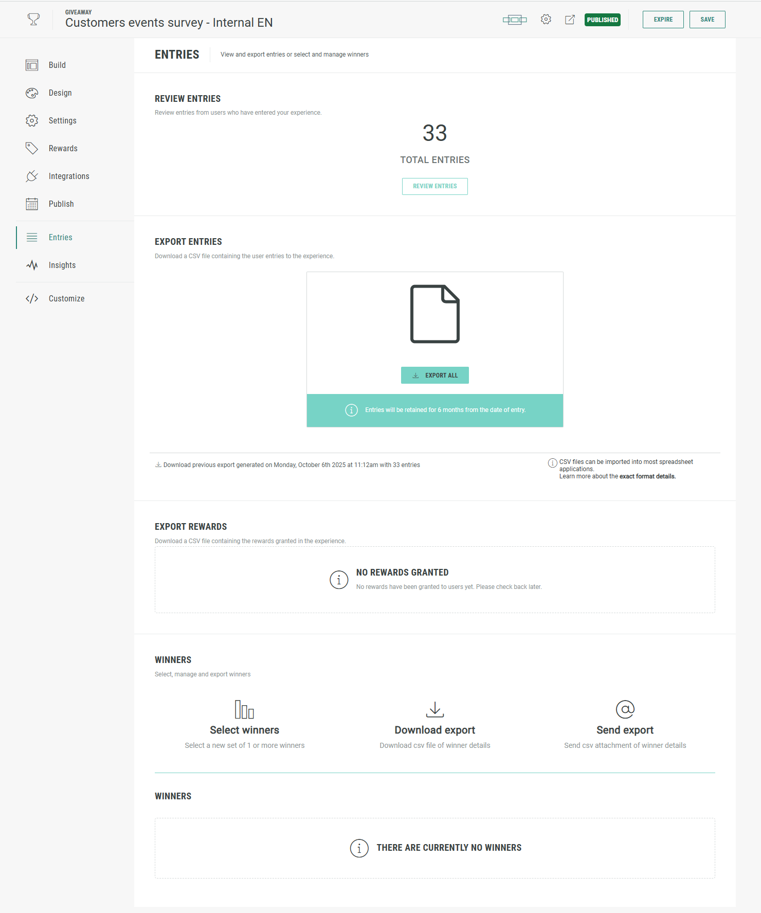 The Winners section is used for prize draws — it's where you can pick winners post-launch of an Experience campaign. (Note that this is different from the My Rewards module, which handles instant-win prizes distributed during the Experience rather than post-launch draws.)