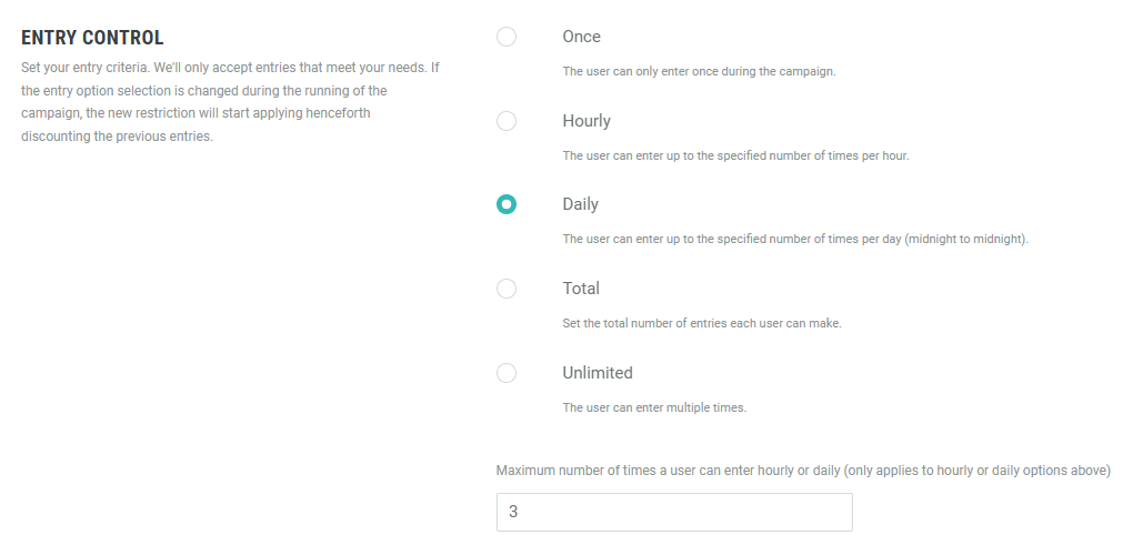 - Daily — The participant can enter the Experience up to the specified number of times per day (midnight to midnight).