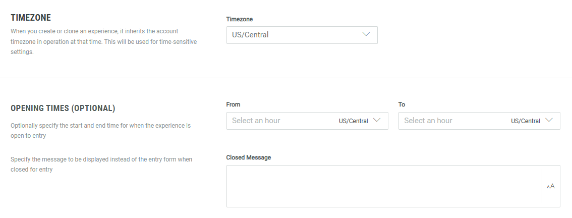 Note: When you create or clone an Experience, it inherits the account timezone in operation at that time.