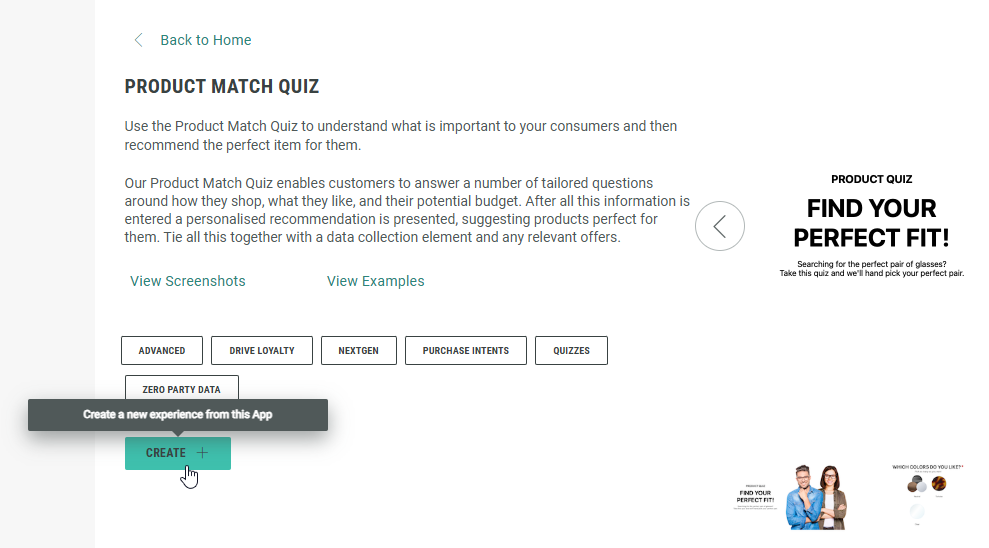 Instead of the Preview Experience link, for some Experiences, a View Examples link is available. This shows example screenshots in full size on a different screen, where you can scroll through them by clicking the left/right arrows. That way, you have an idea on how the final Experience may look like (for different verticals).