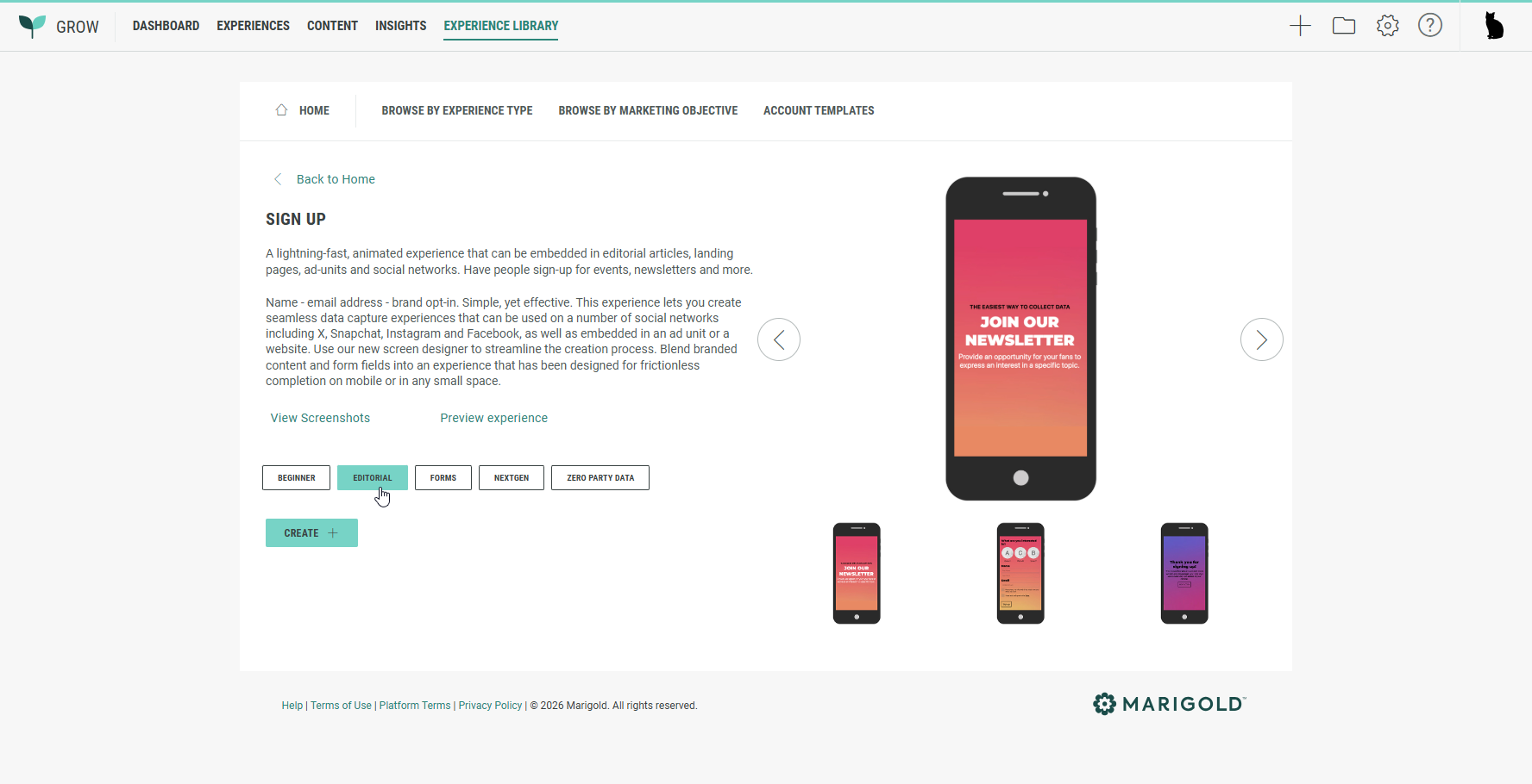 For example, clicking Editorial leads to the Experiences page with all Experiences designed for the Editorial marketing objective.