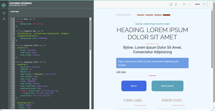 You can add custom CSS to alter the look and feel of the Experience. It will override any base CSS or theme.