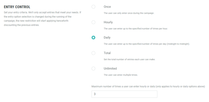 Note: The entry control criteria and maximum entries setting only apply when the Experience is submitted. This means participants who start but don't complete the Experience (e.g., if they drop off before submitting) won’t have their attempt counted toward these limits.