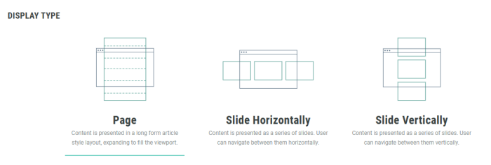 1. Display Type — You can set your display layout to be a page, horizontally navigated slides, or vertically navigated slides.
