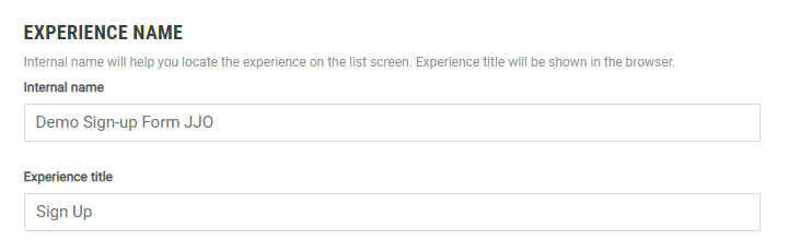 1. Experience Name — Set an internal name to help you identify this Experience in the list of all Experiences, and an Experience title that will appear in the browser (page/tab title) when someone accesses the Experience.