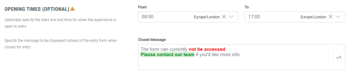 1. Opening Times (optional) — You can set the start and end times to control when the Experience is available for entry (for example: only during office hours).