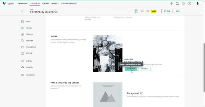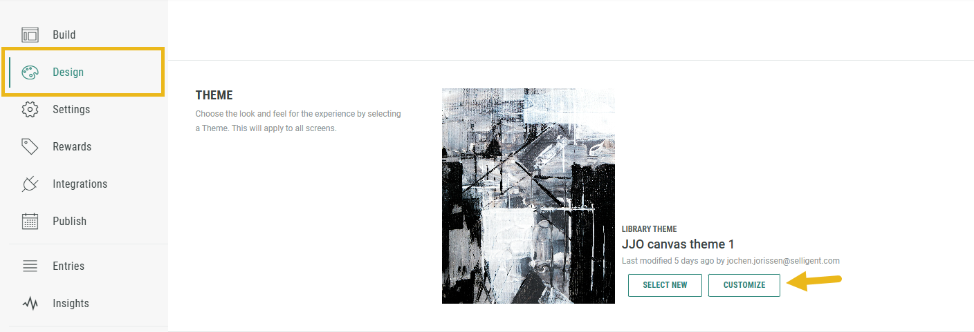 For existing Experiences, select Design in the left hand side navigation and click on Select New in the Theme section.