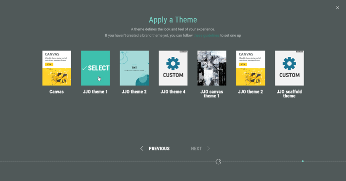 A theme can be selected when creating a new Experience, on the Apply a Theme step.