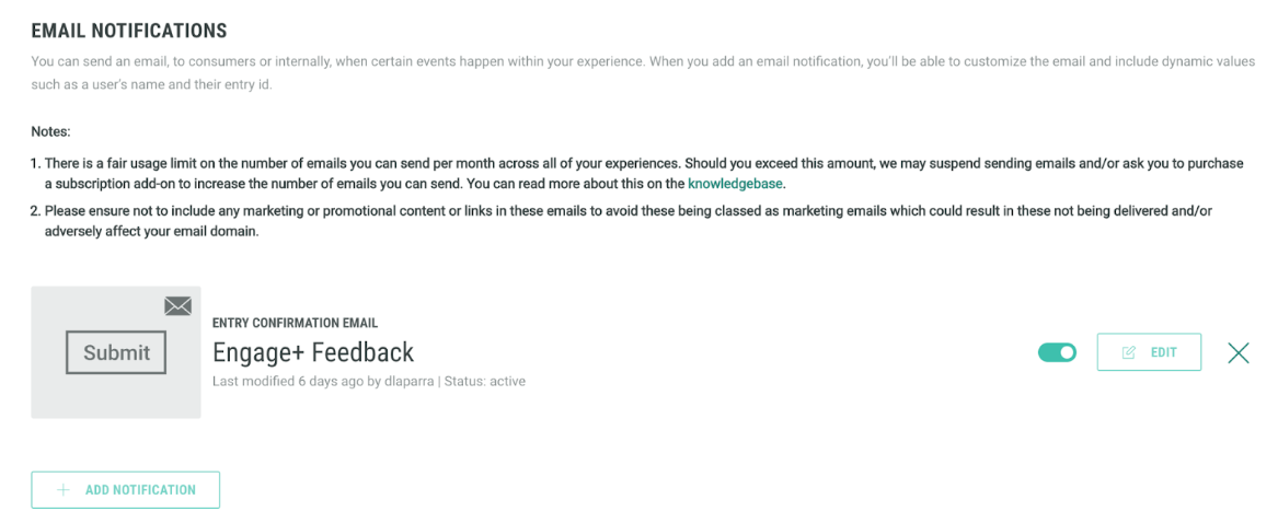 There is a fair usage limit on the number of emails you can send per month across all of your Experiences. Should you exceed this amount, we may suspend sending emails and/or ask you to purchase a subscription add-on to increase the number of emails you can send. If you believe your usage will exceed the fair usage limit, you must raise this with your account manager or CSM ahead of usage so they can walk you through the options.