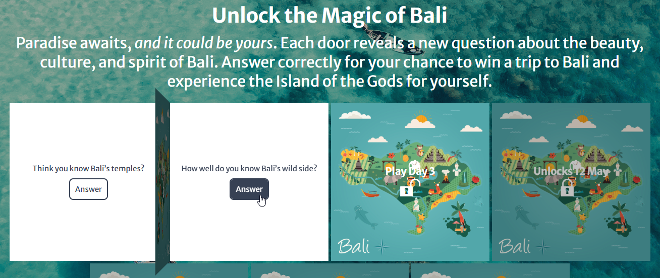 You can click the Advent Calendar cards (promotions) to open the doors and see what's behind them, and click configured CTA buttons, such as those that lead to an answer/opt-in form.