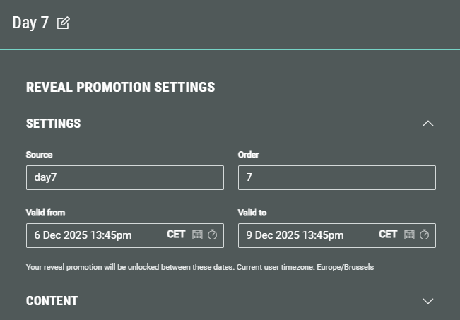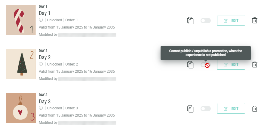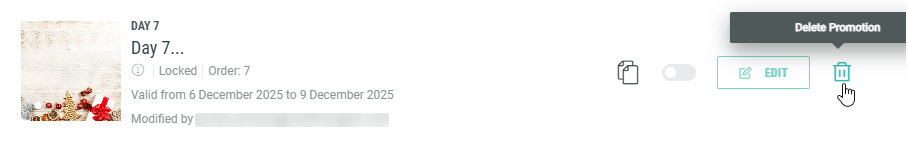 A newly created Advent Calendar Experience contains some preloaded example promotions, which you can tailor to your needs. You can also delete existing ones and add new ones.