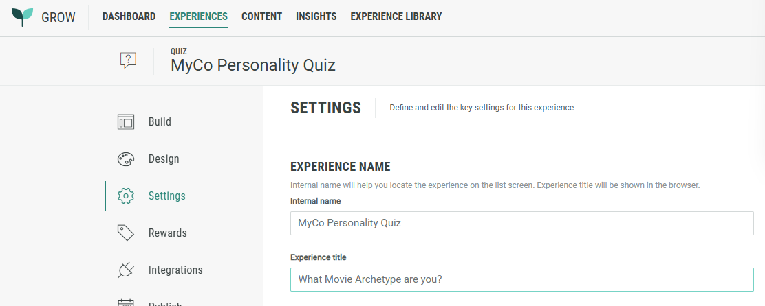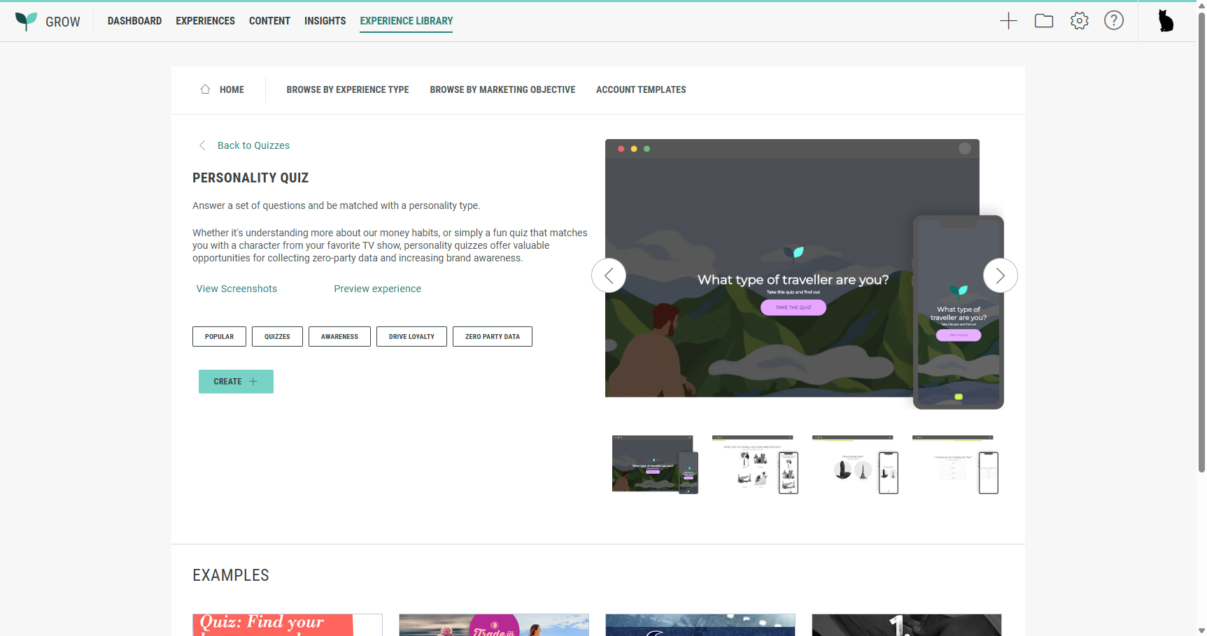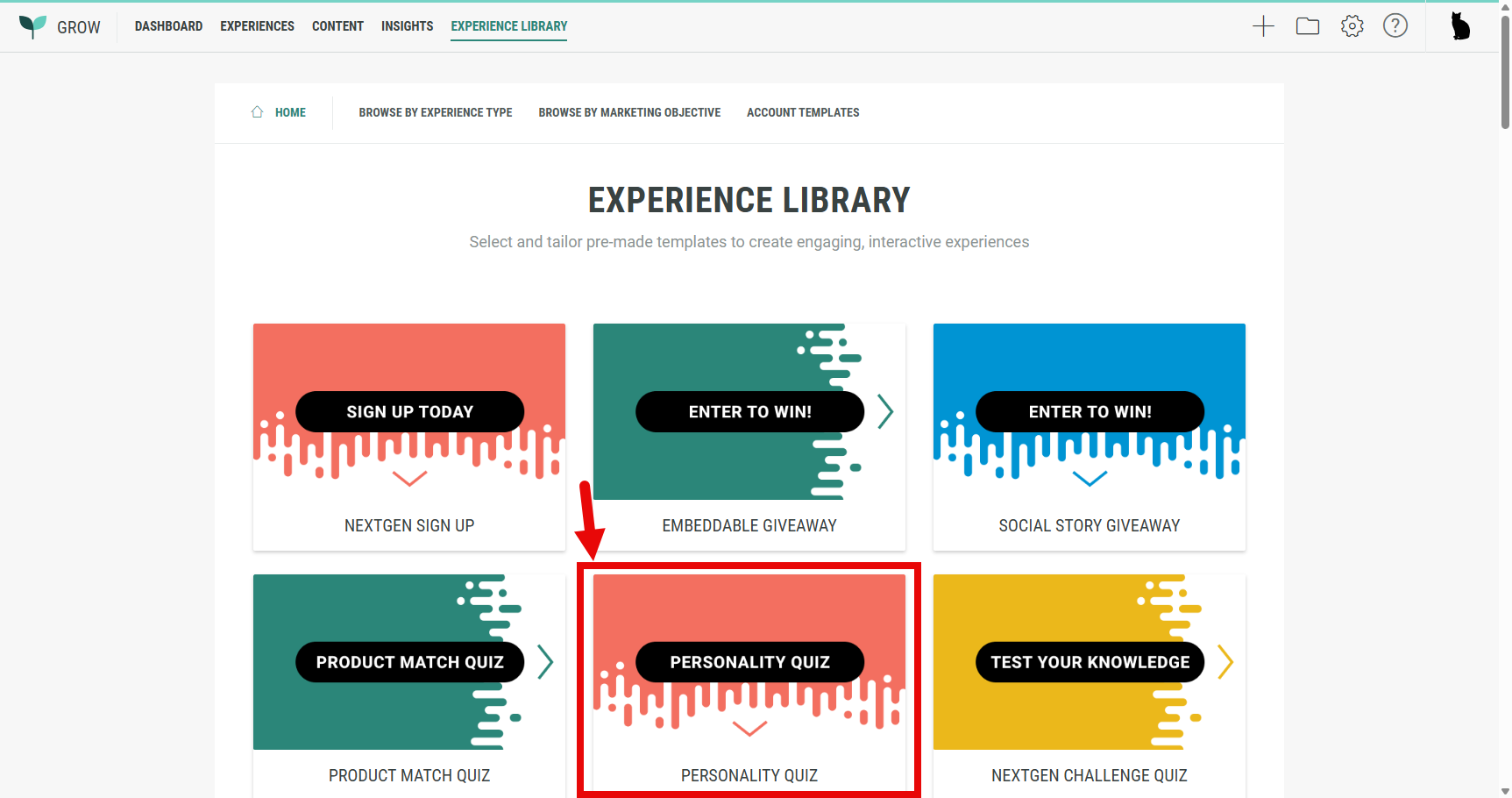There are multiple Outcome-based quiz Experiences available from the Grow Experience Library: