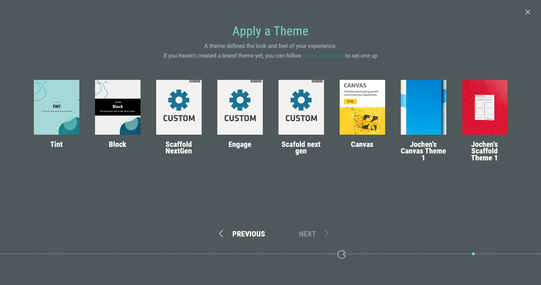 - Apply a theme. You can select one of your available themes. The theme determines the look and feel of your Experience.
