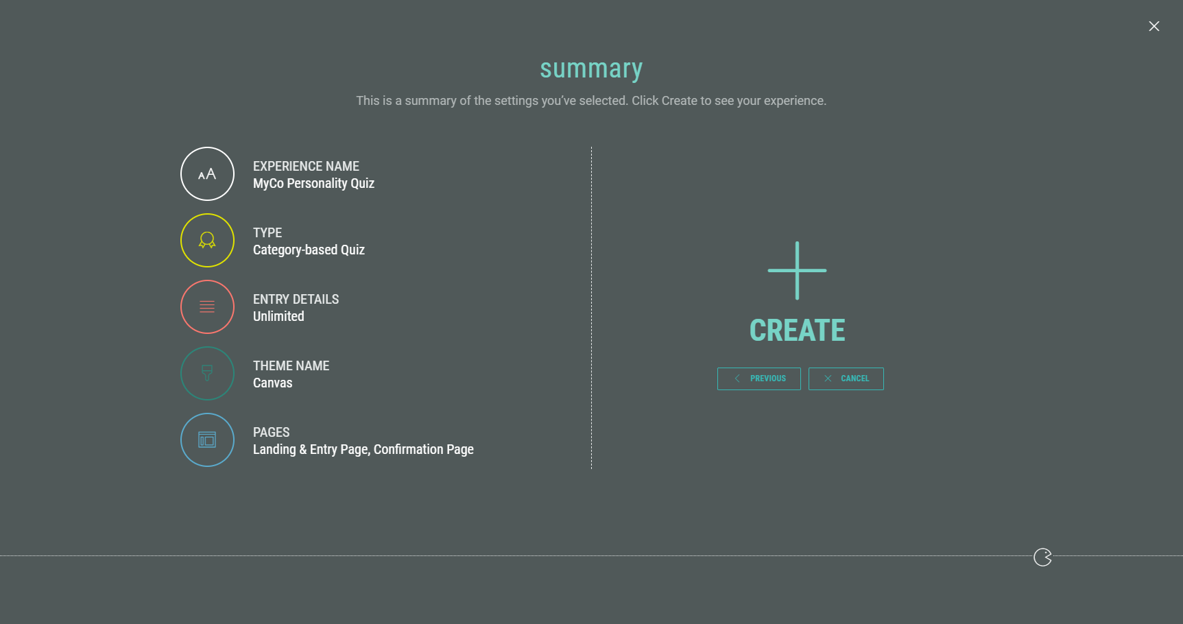 - Click the Create + button. A wizard is then presented to you to set up the basics for your new Personality Quiz.