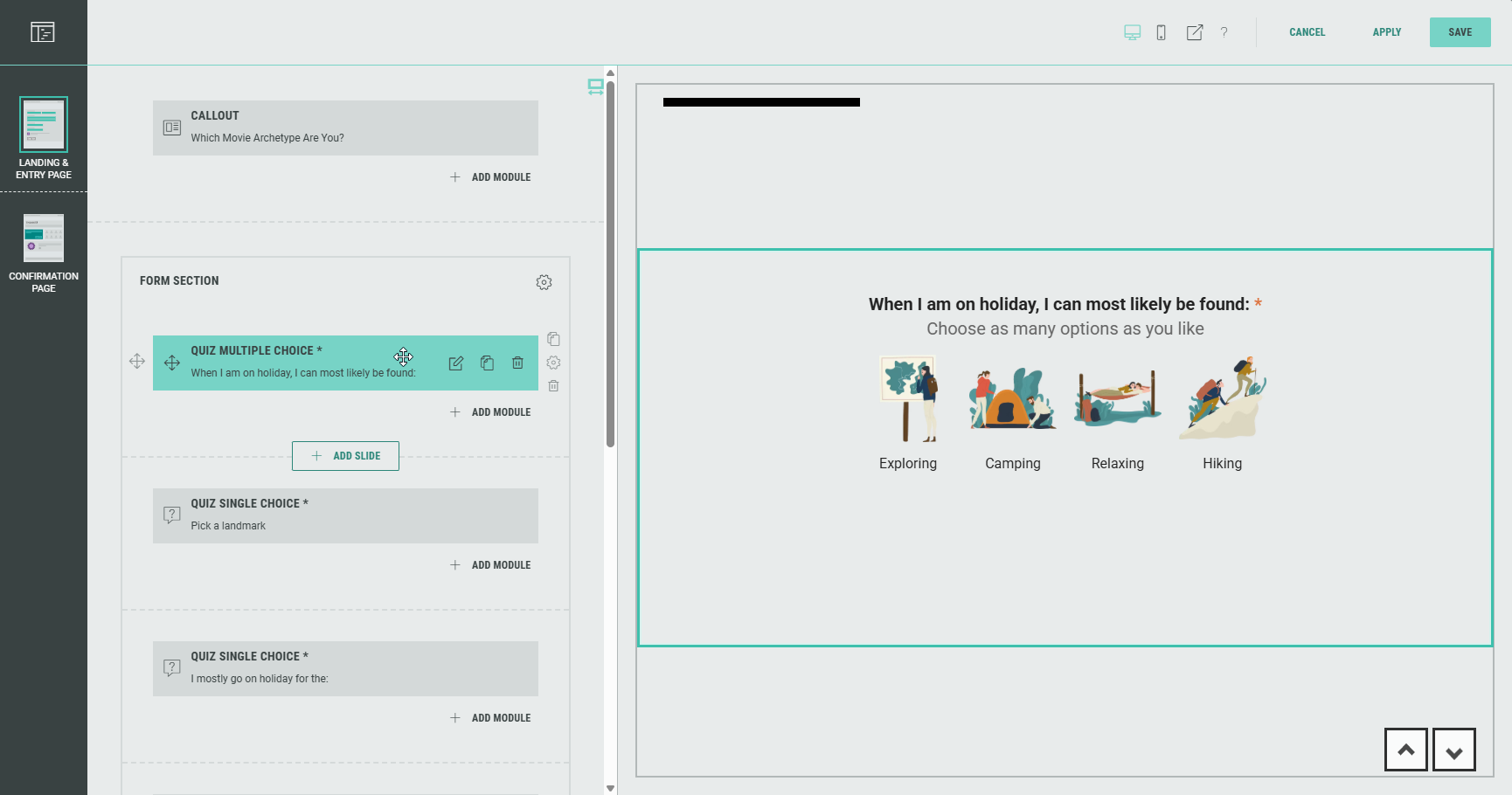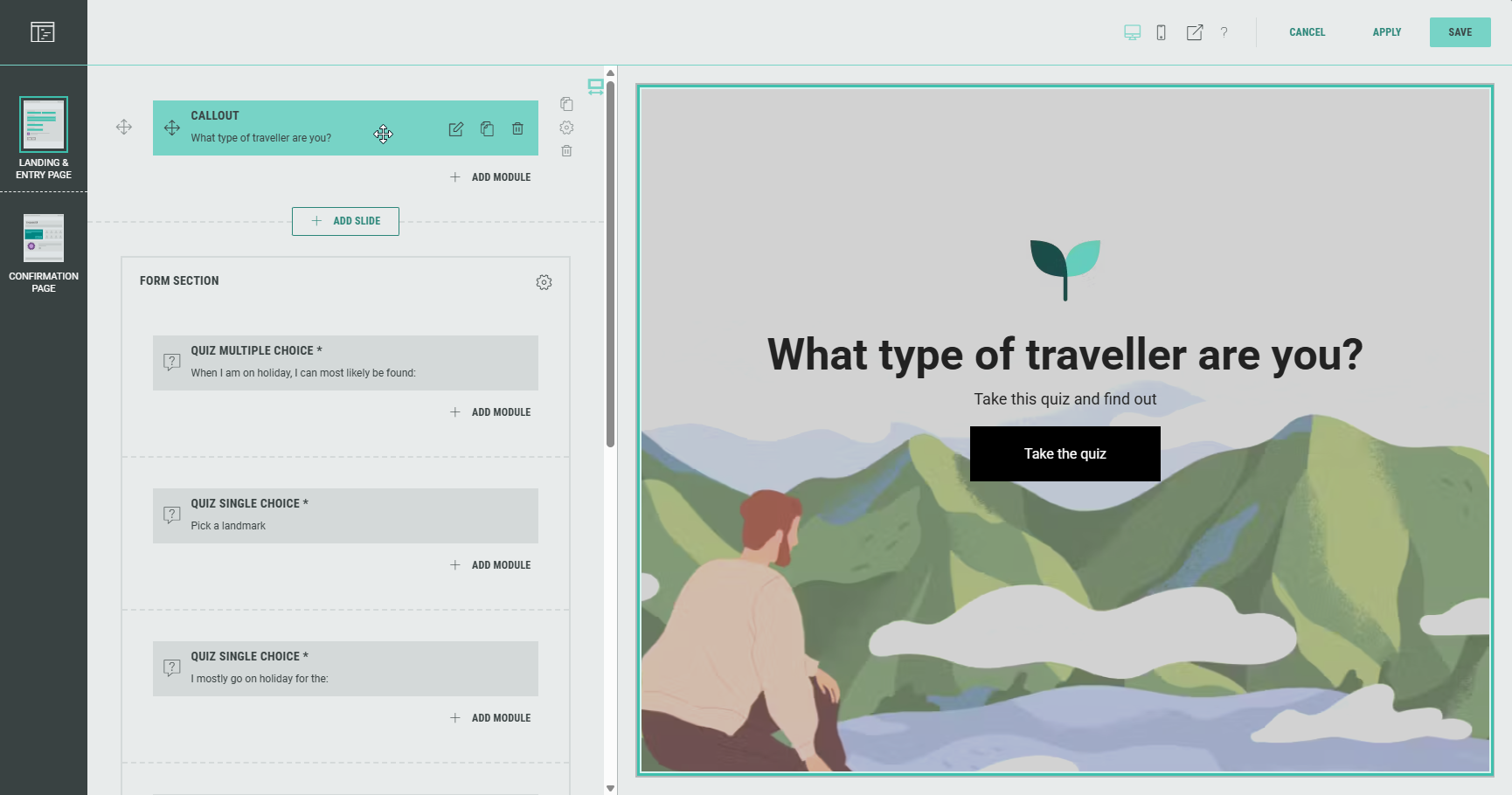 The Landing & Entry Page in the Personality Quiz by default contains five slides: a Callout slide and a Form section with four slides.