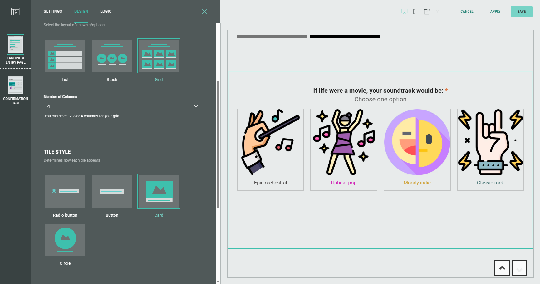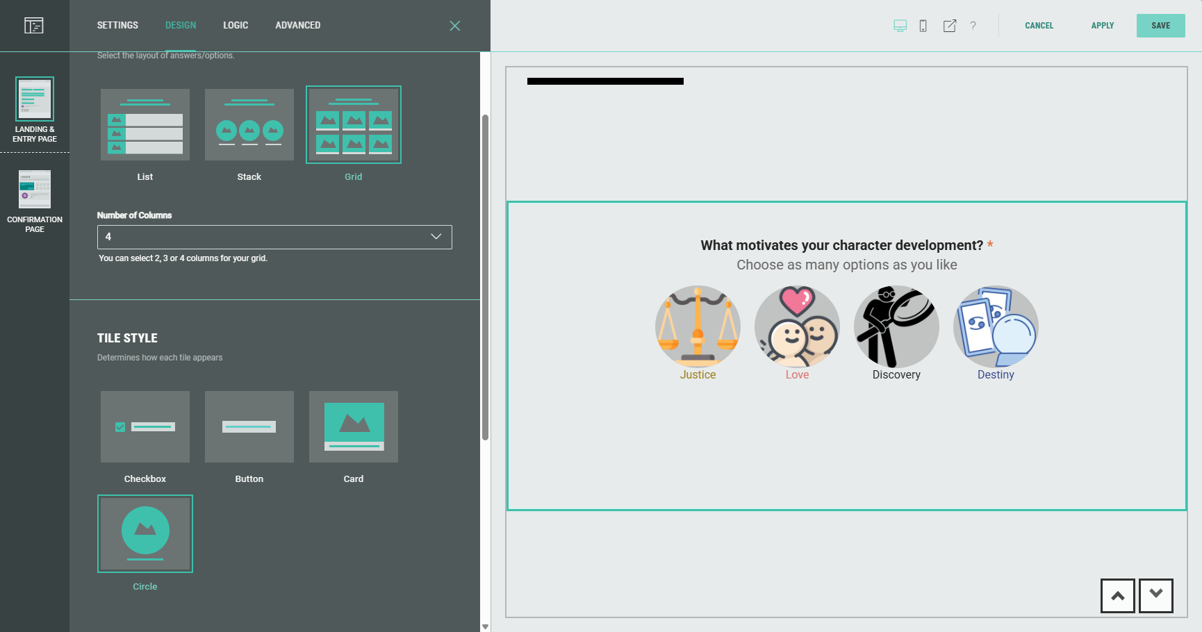On the Design tab, we change the field width to medium, template to grid with 4 columns, and the tile style to circle.