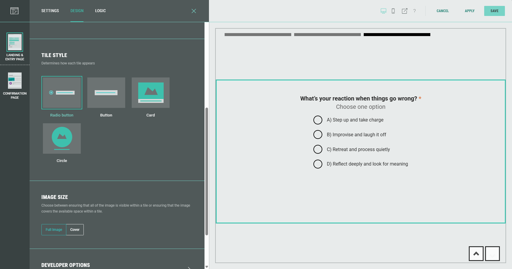 On the Design tab, change the field width to medium, choose list as template style, and select radio button as tile style.