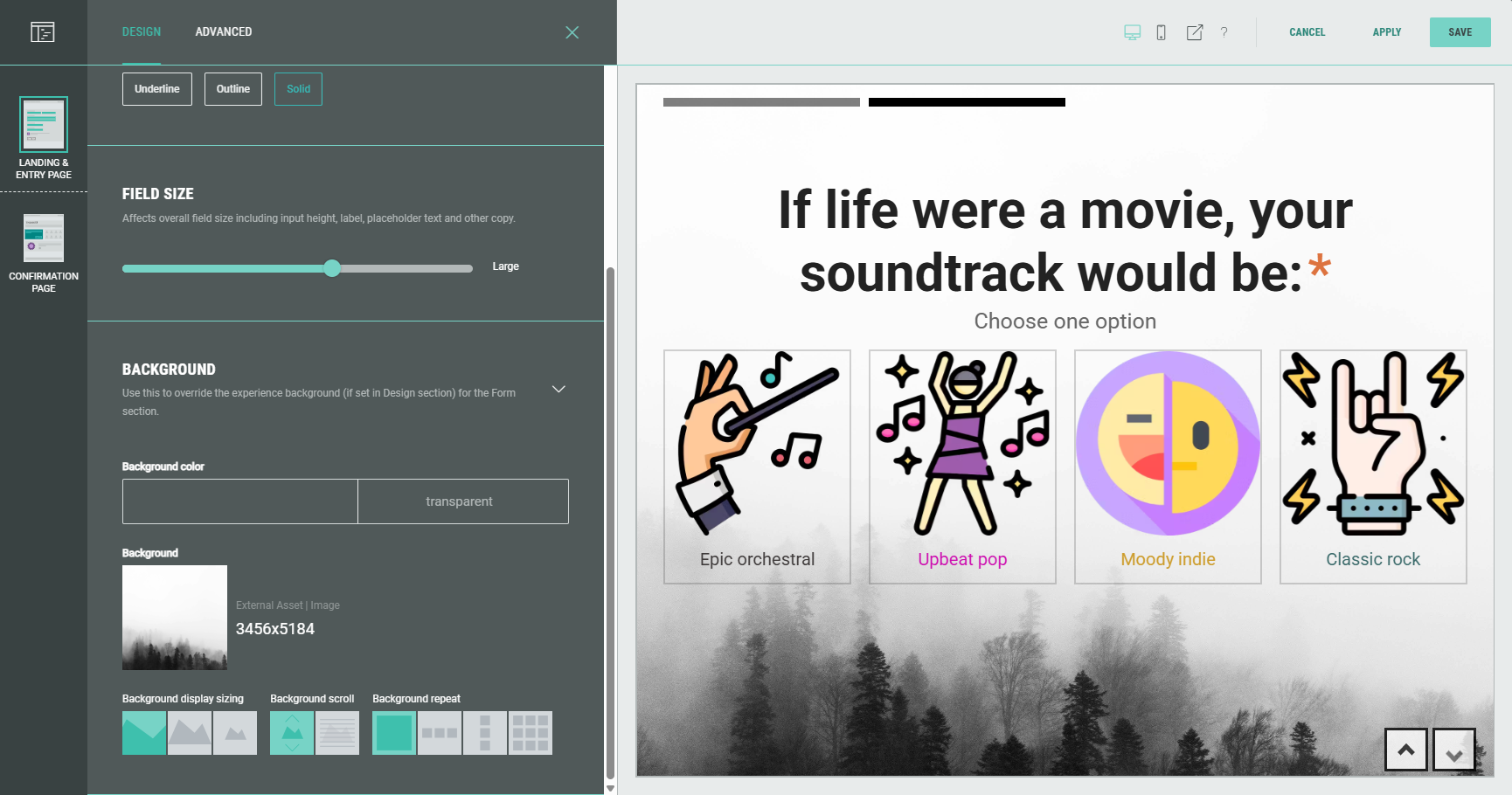 Example: In the Form Settings, let's set the field size to large, and add a background image.