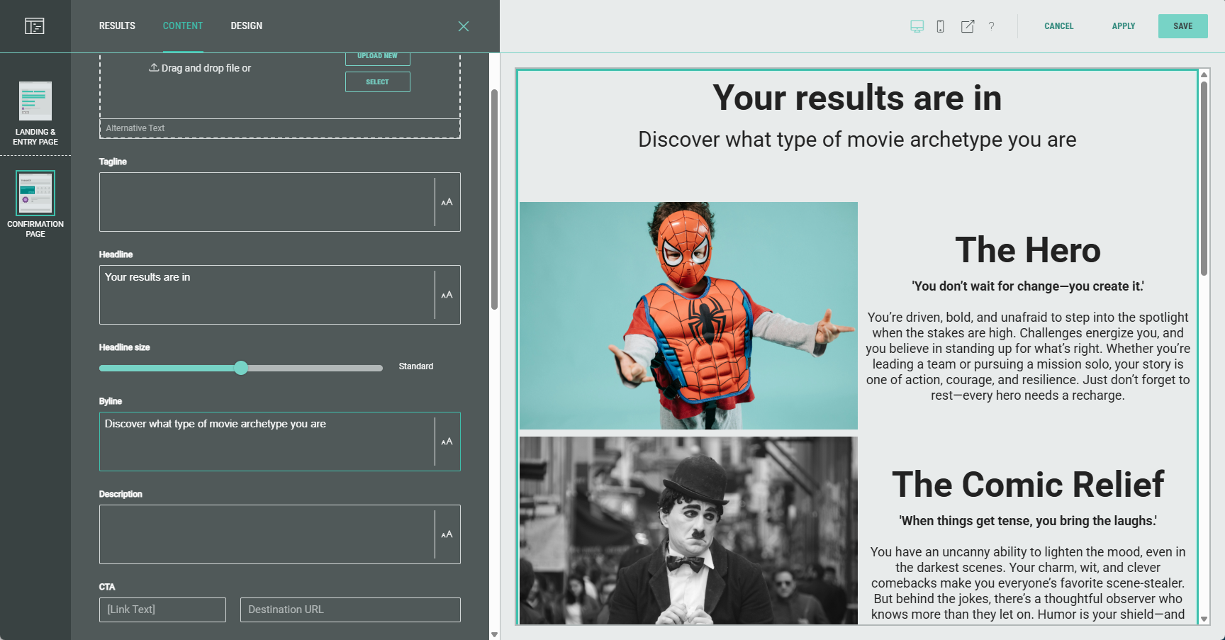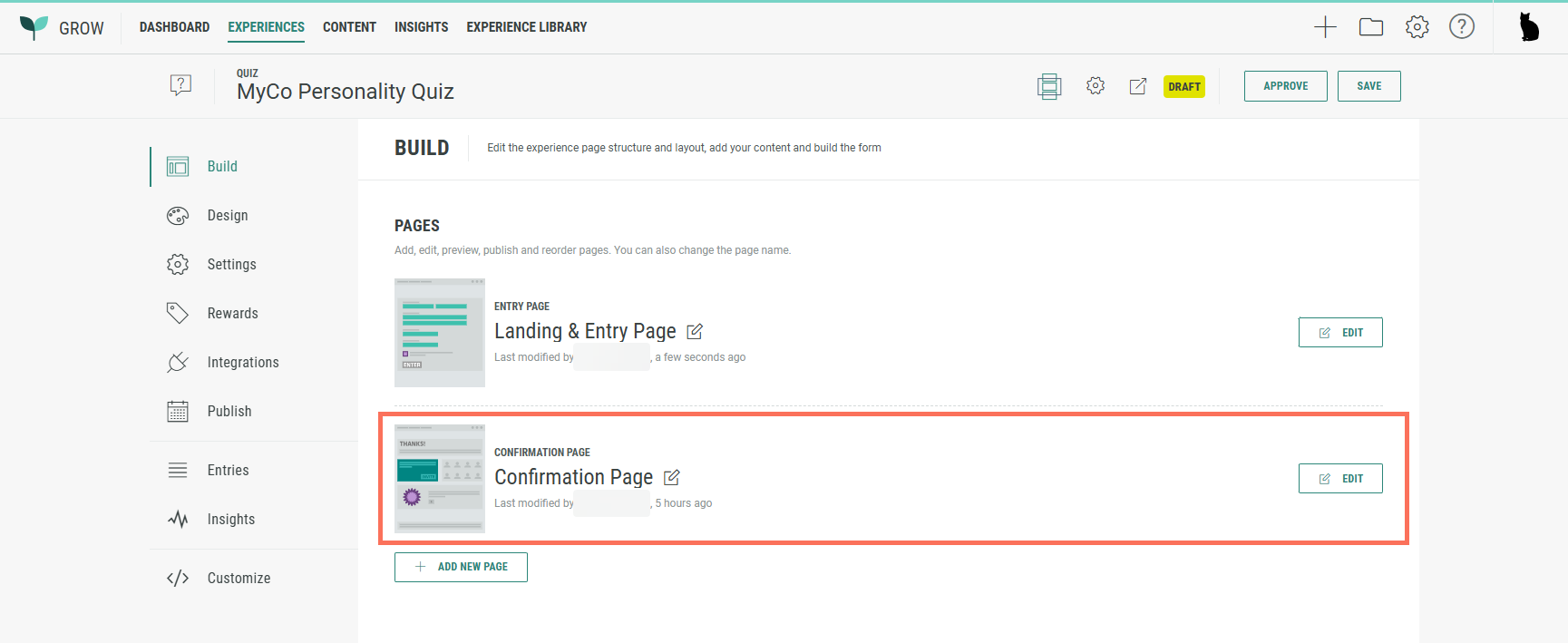 The Build tab offers an overview of the pages included in your Experience. The Personality Quiz by default comes with a Landing & Entry Page and a Confirmation Page.