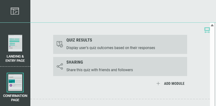 The Confirmation Page contains a Quiz Results module and a Sharing module.