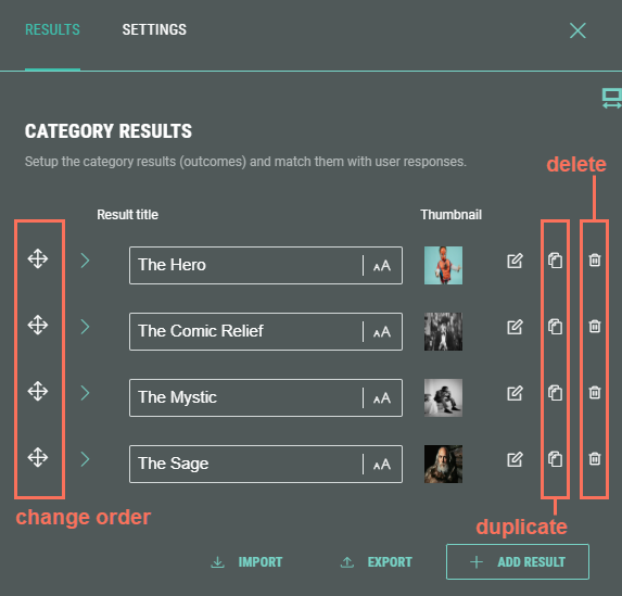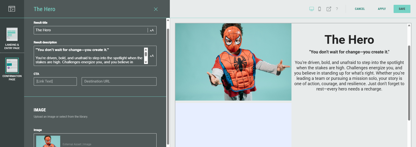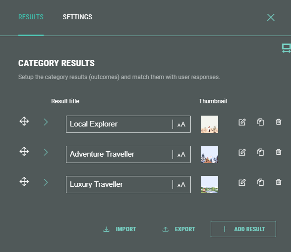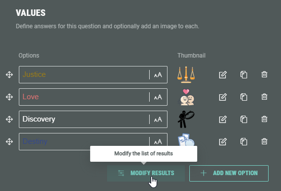 - For each option, set the result title, description, image, and Friendly ID (for third party synchronization).