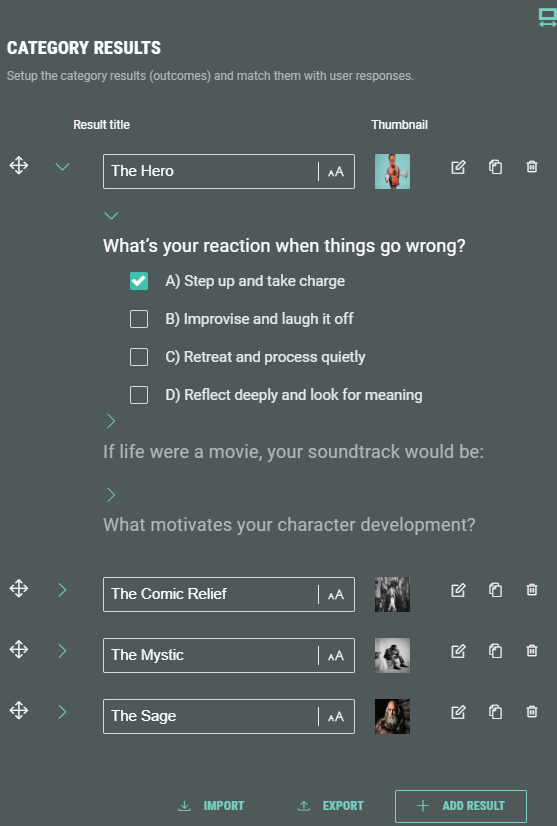 Enabling the closest match means the quiz uses OR logic, where any match contributes to the outcome. This allows (personality) quizzes to better reflect individual variations.