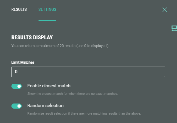 - Random selection — Enable this toggle to randomize the results shown, when there are more matching results than set as the limit above.