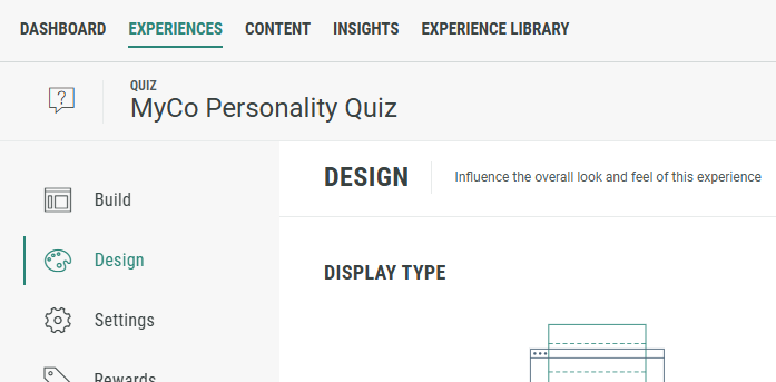 The Design tab can be found directly below the Build tab. Here, you can customize your Experience with the Display Type (Page- or Slide-based), change or edit the Theme, and add a footer and background in the Page Structure and Design section.