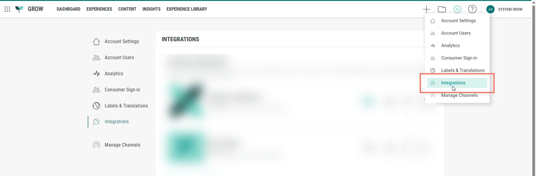 - At the top-right of Grow, click on the Gear icon and select Integrations from the drop-down.