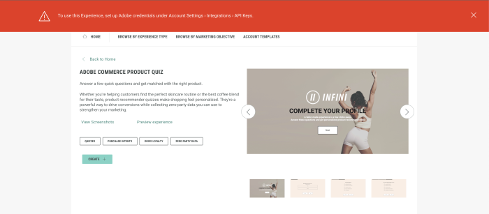 Note: If no Adobe Commerce API key exists, an error pops up when you try to create an Adobe Commerce Product Quiz Experience.![]()