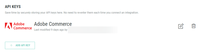 You return to the Integrations screen, where the Adobe Commerce API Key is now visible.