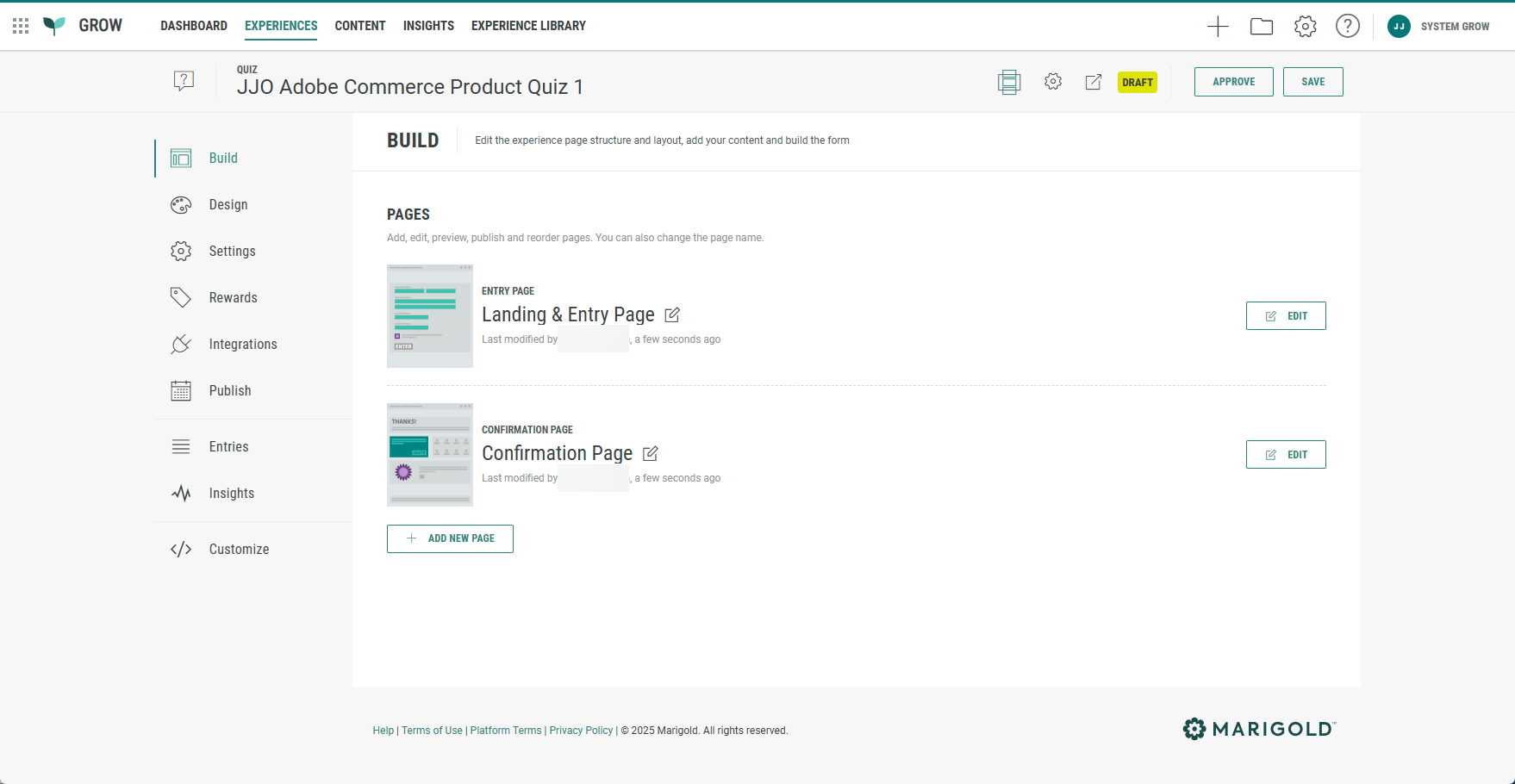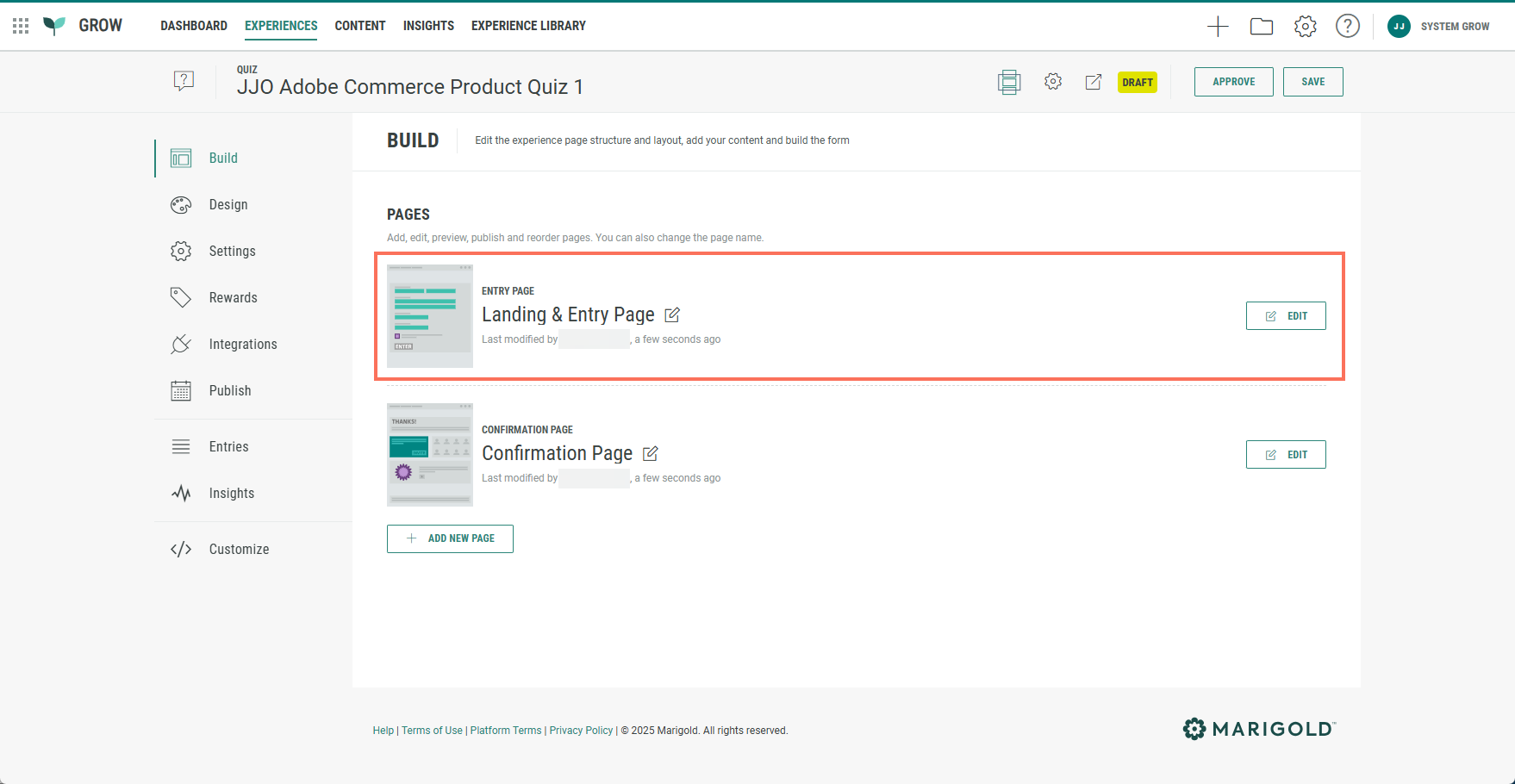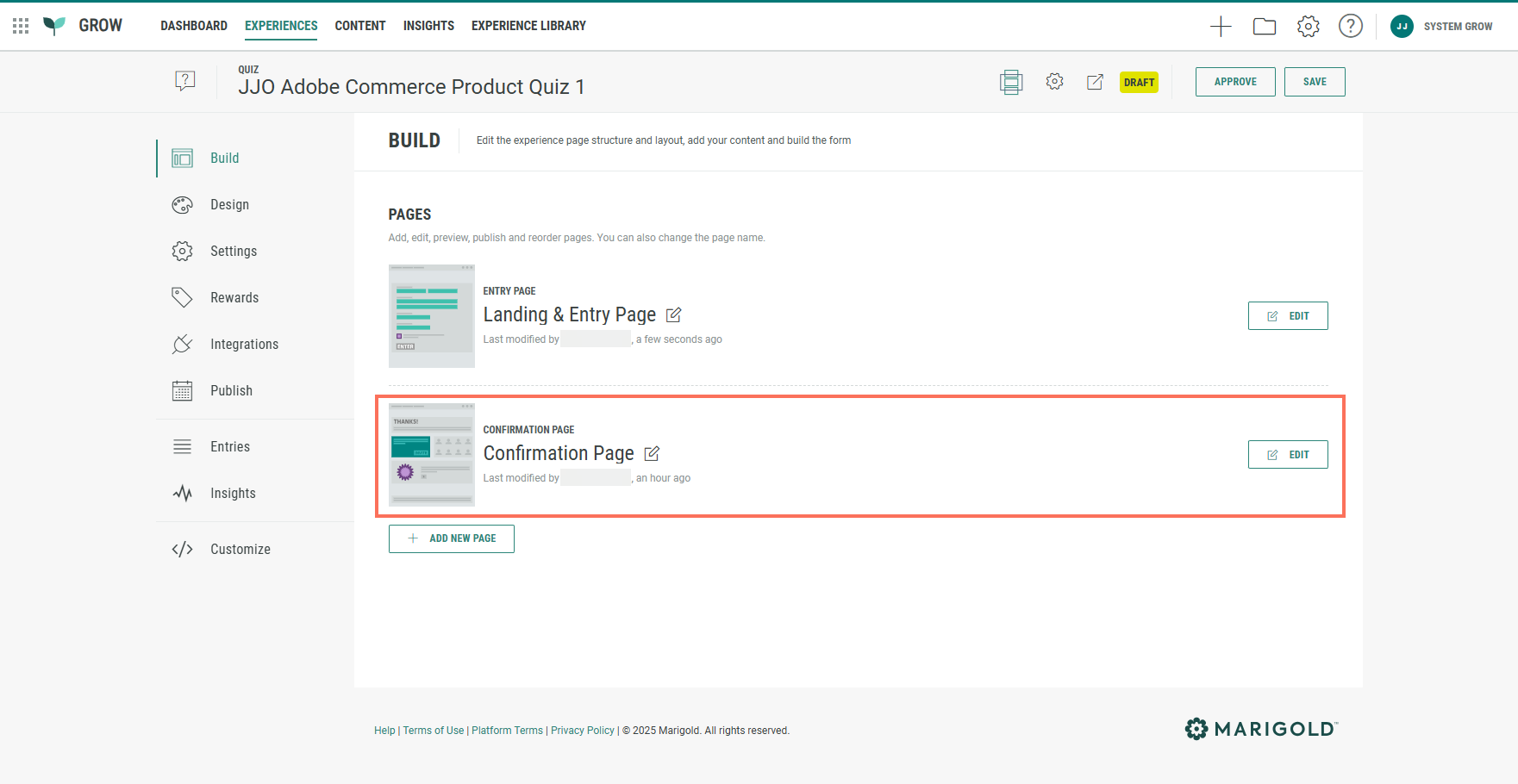 The Build tab offers an overview of the pages included in your Experience. Our Adobe Commerce Product Quiz comes with a Landing & Entry Page and a Confirmation Page.